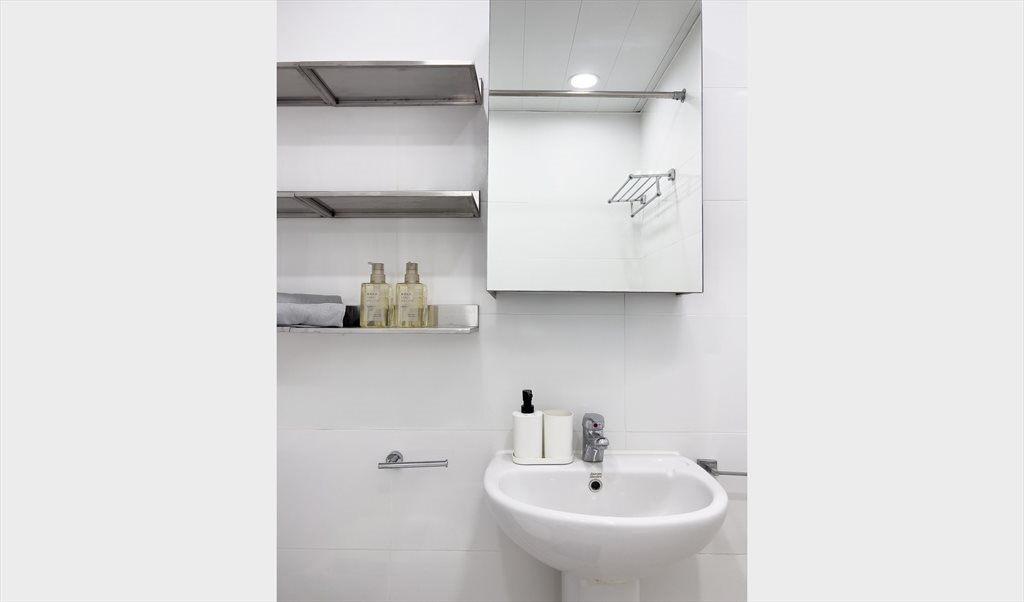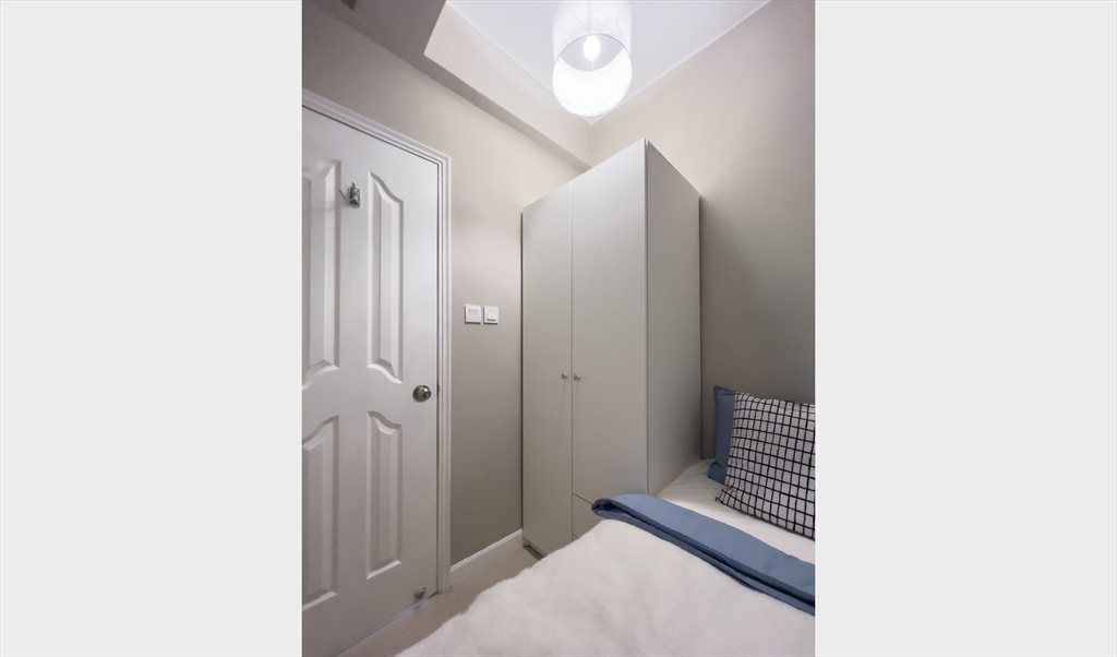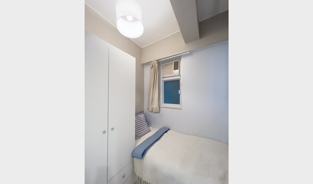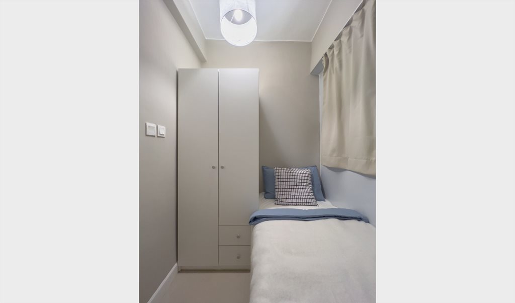 Fully furnished private room with single bed in a renovated apartment at Hoi To Court, Gloucester Road, Causeway Bay — 10% discount for online booking. Located on 7/F, just 3 minutes to Causeway Bay MTR. The flat includes a new washing machine, refrigerator, microwave, iron & ironing board, and clothes dryer. The room has storage space, a work area/desk, a single bed with a new mattress, and bed linen included.