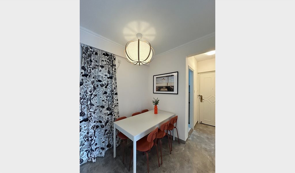 • Living room: big dining table + 6 chairs, clothes rack, sofa (if provided), coffee table, mirror